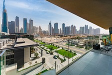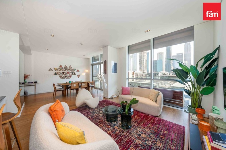 The apartment offers a large open-plan living area, floor-to-ceiling windows flooding the space with natural light, and a spacious balcony perfectly oriented towards Downtown Dubai’s skyline.
